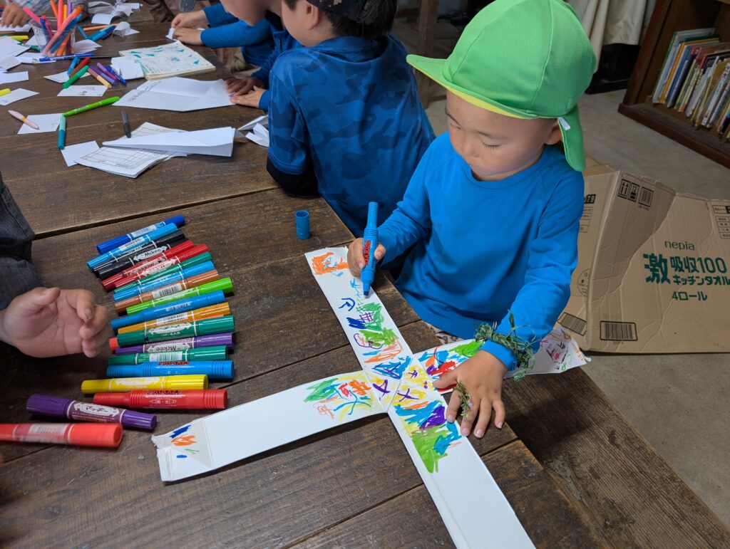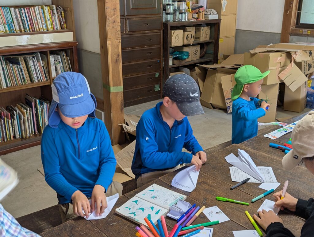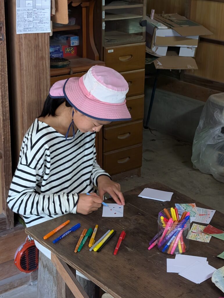 限られた時間の中、小学生も色々考え、白いカードで、自由に作ることにしたようでした。名刺や小さなペン画、紙飛行機などなど、いろんな物が生まれていました。