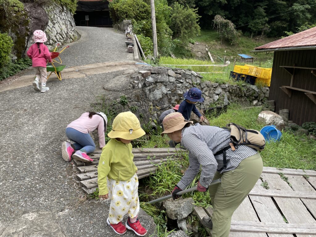 朝の会を終え、お地蔵さんにご挨拶をしたあと、みんなで溝掃除をすることにしました。