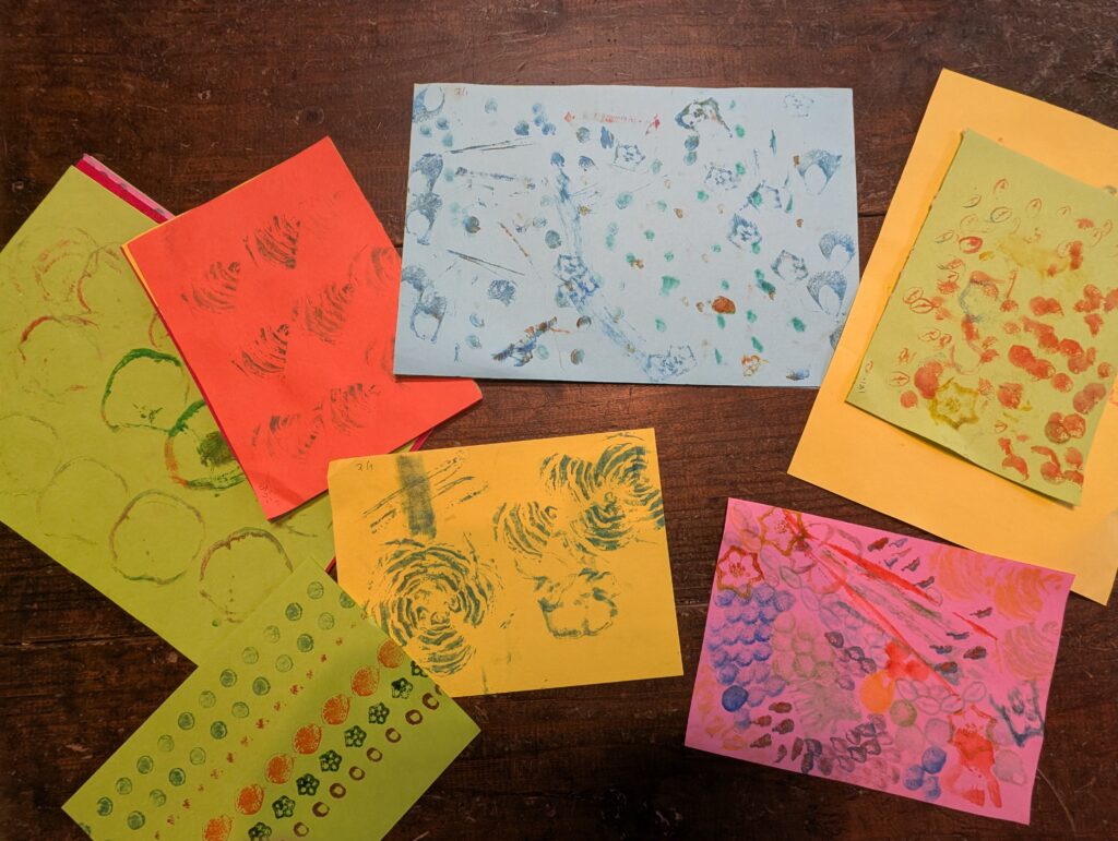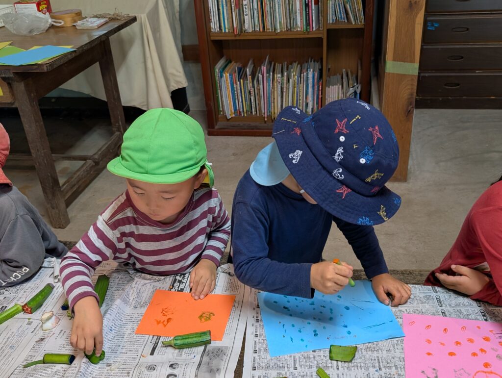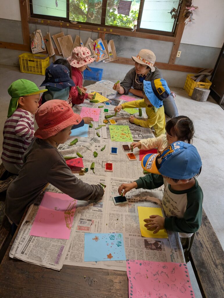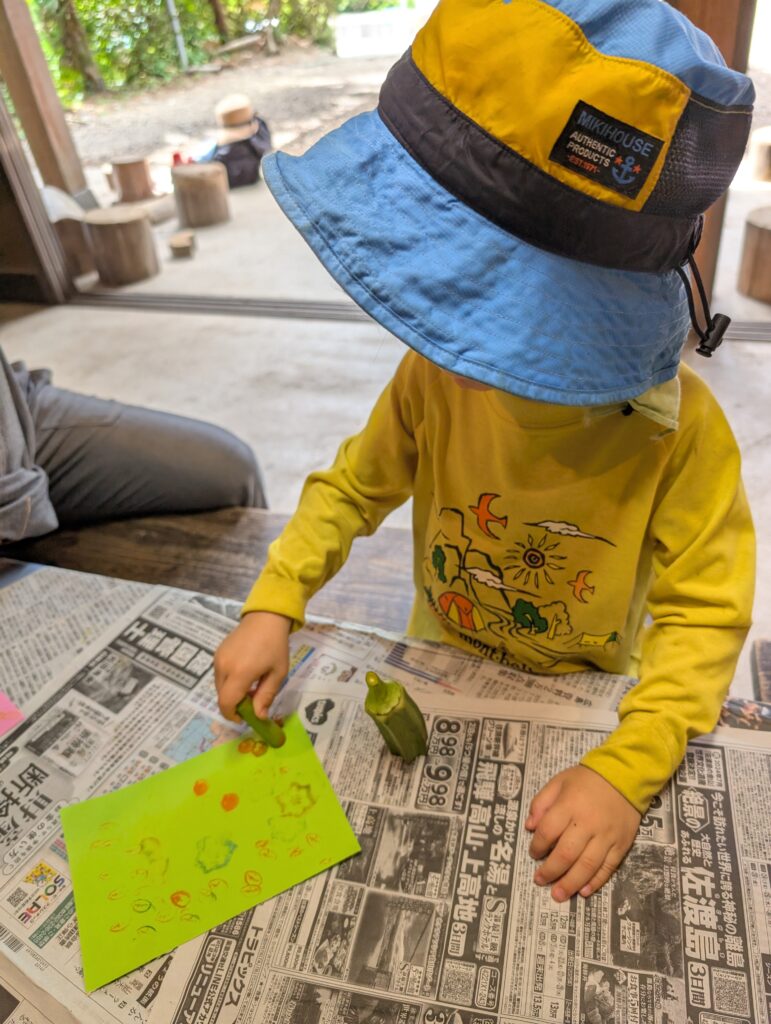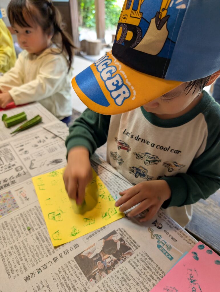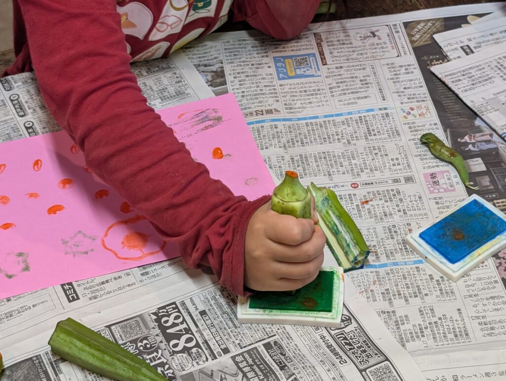 夏にぐんぐん大きくなって、大きくなりすぎたオクラを、毎年造形の時間にスタンプで楽しんでいます。20センチ級のものは、カッターでもなかなか切れないですが、長い分、端から端までいろんなサイズの形が取れて面白い!!