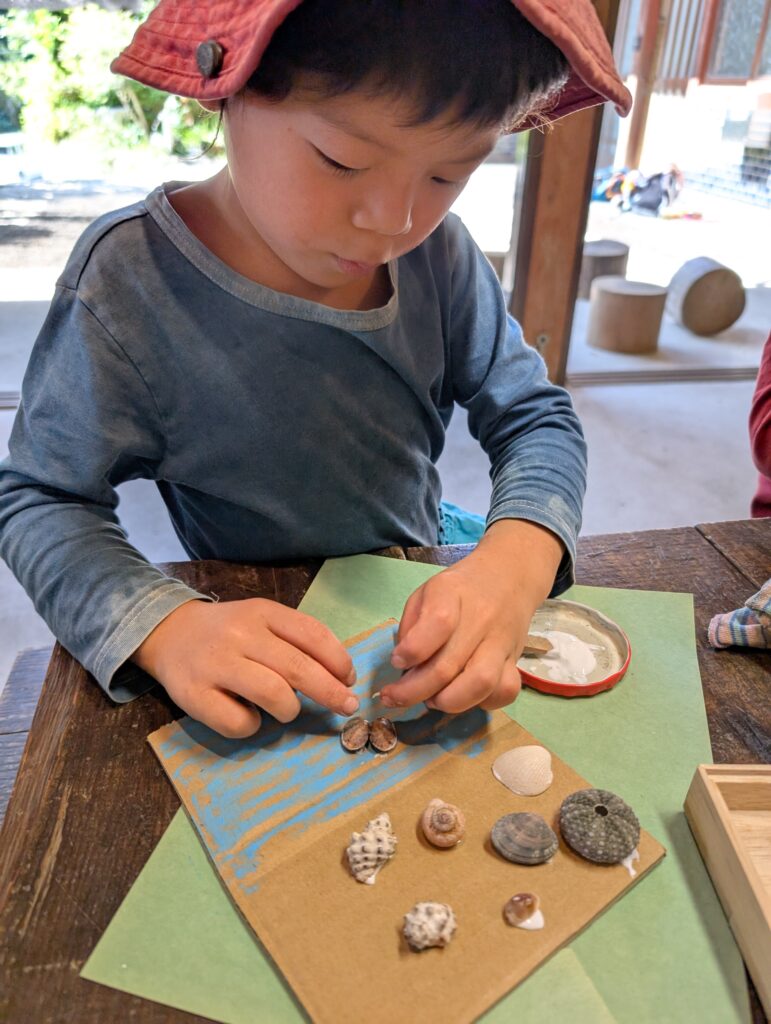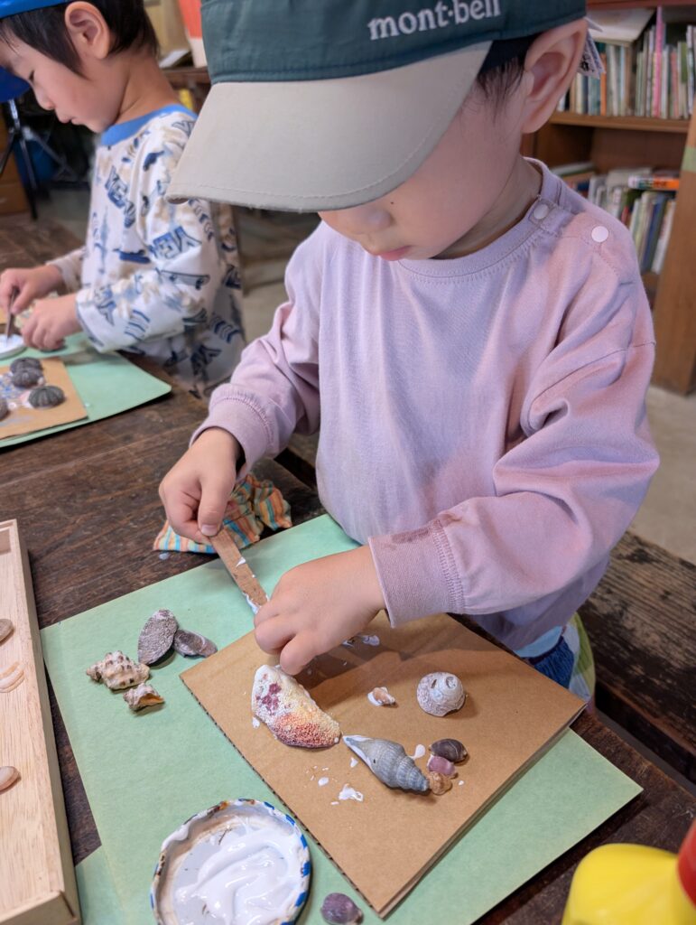二枚貝は、どこにボンドつけるか問題がありますが、真ん中(窪んでいる方)にボンドつけると「くっつかない〜!」という経験を通して、縁につけたらくっつくという事を学んでいました。