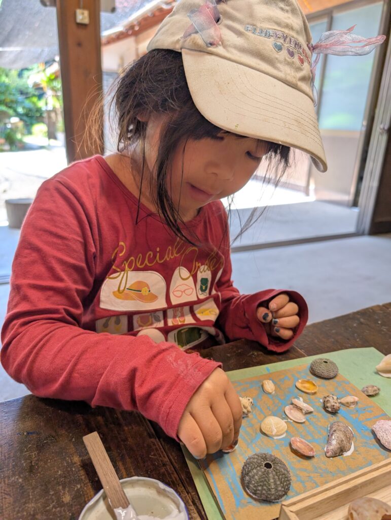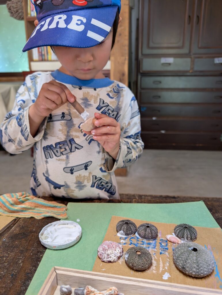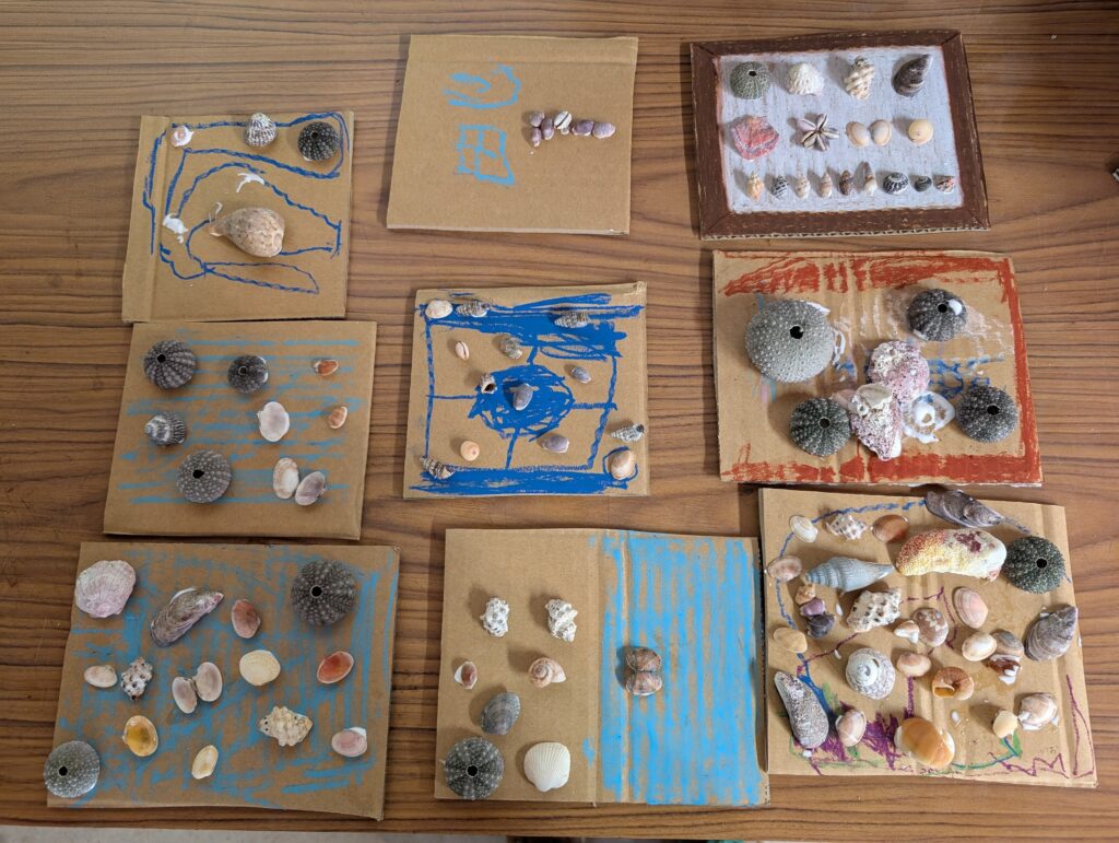 巻き貝、二枚貝、ウニの殻など大小様々な貝がらを土台にくっつけたり、色をぬったり。