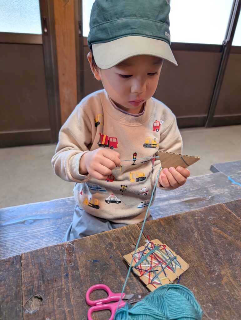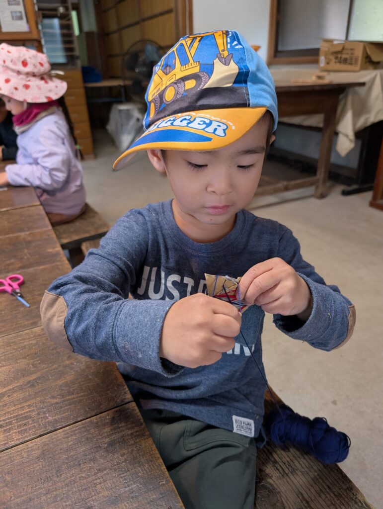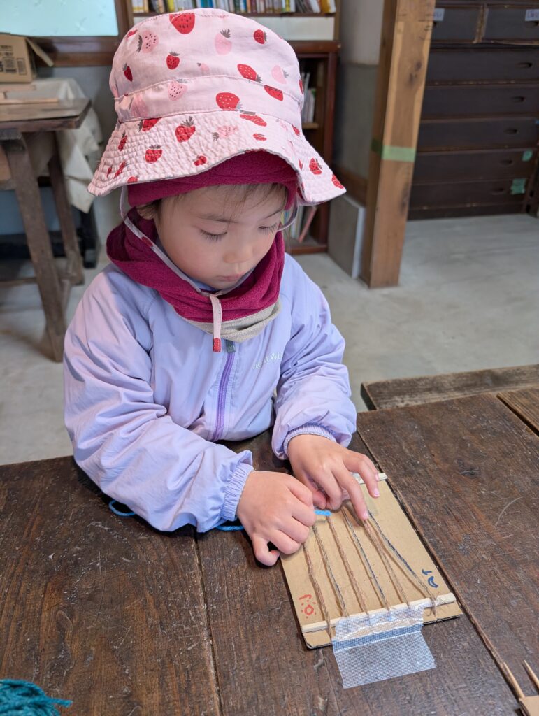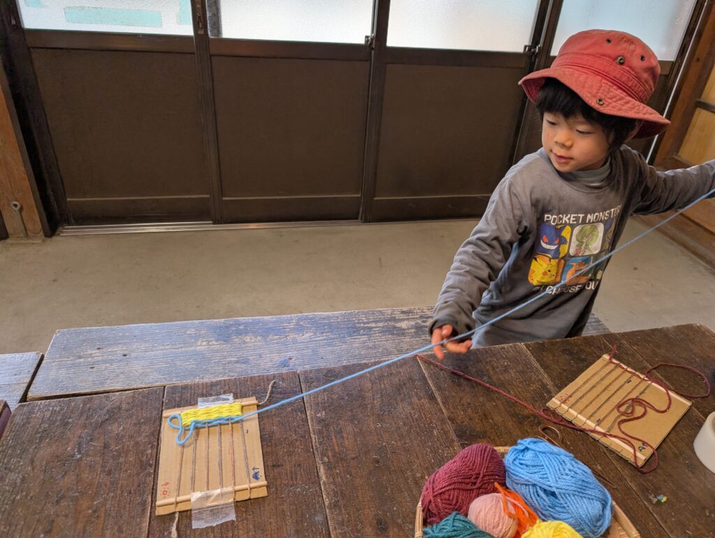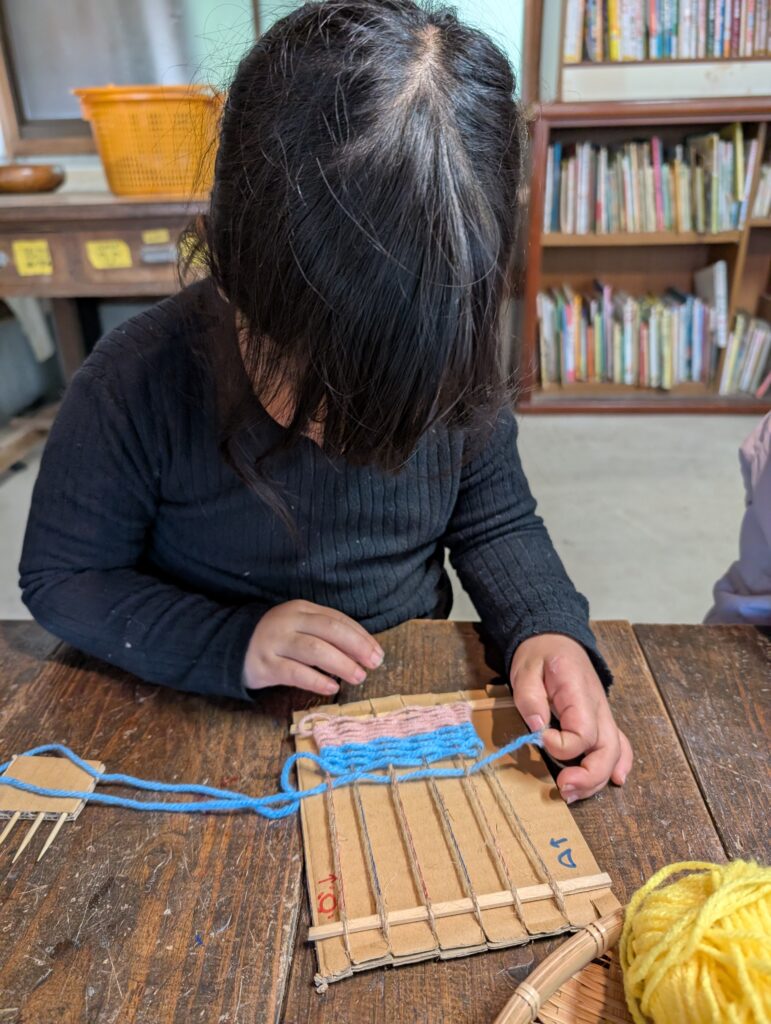 手作り織り機を使って毛糸を織り込んでいきますが、縦糸を赤い道と青い道に分けて、毛糸をへびさんに見立てて通します。