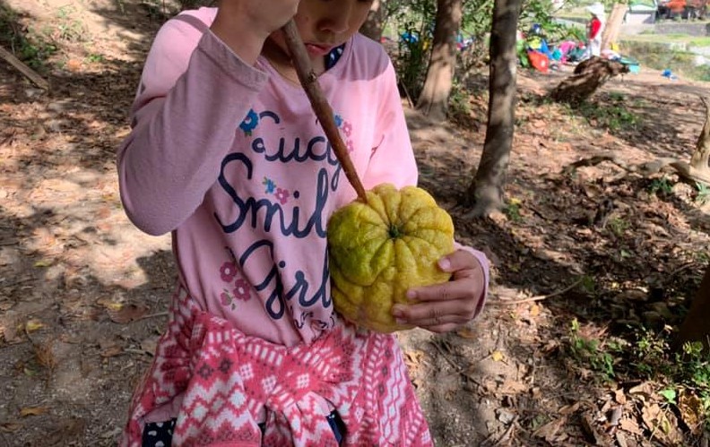 分厚い鬼ゆずの皮をその棒でむく年長のAちゃん。