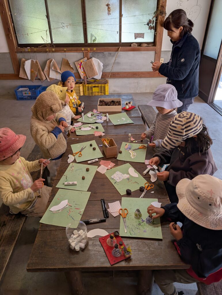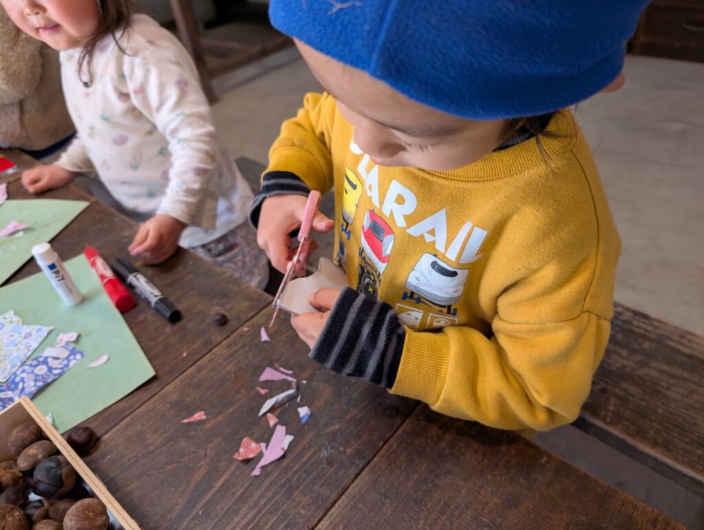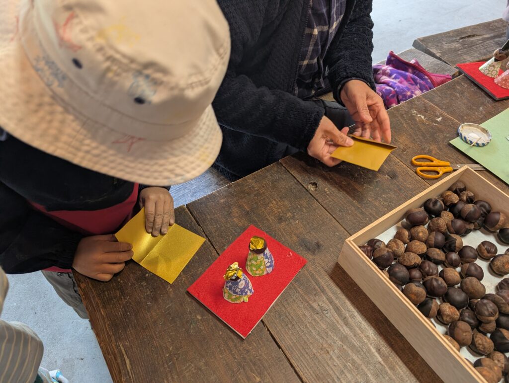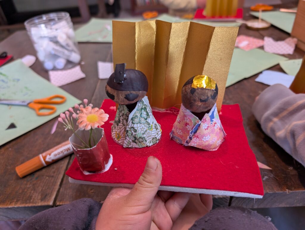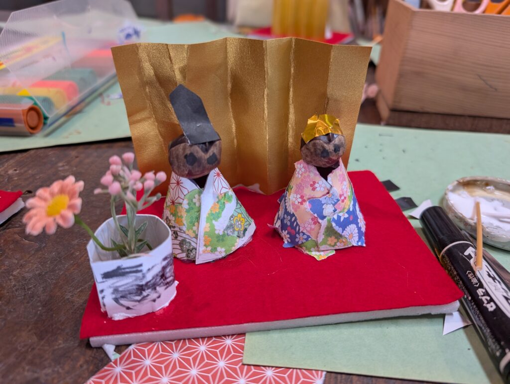 栃の実って、ちょっと顔っぽいので、こちらを使います。お雛様とお内裏様用をそれぞれ選んで、顔も描いて⋯。着物は千代紙を貼り合わせて、ハサミで整えて⋯。今日は工程も多く、なかなか大変でしたが、みな自分で作りあげました。