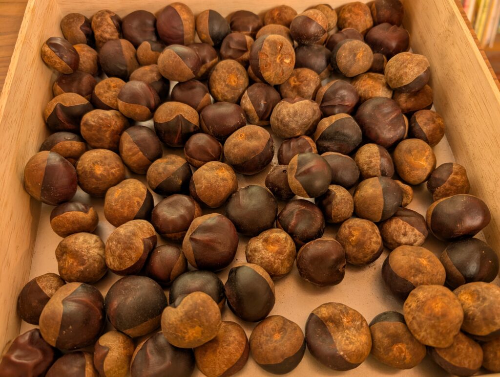 材料はこれ。栃の実です。スタッフが秋にたくさん拾ってくれて保管していたものです。