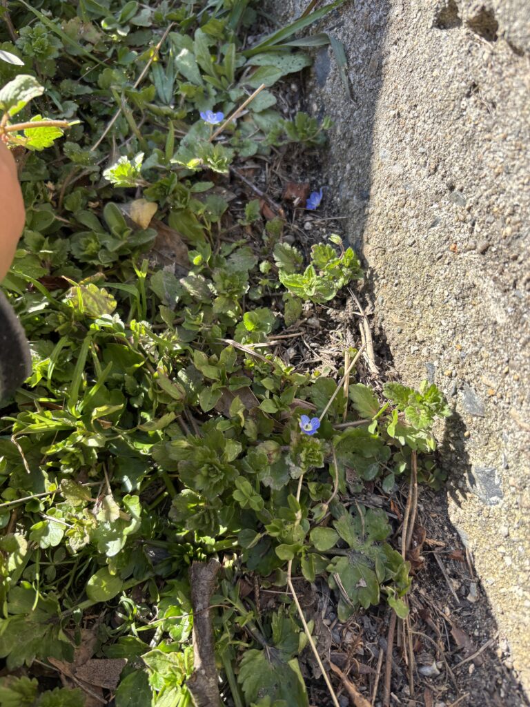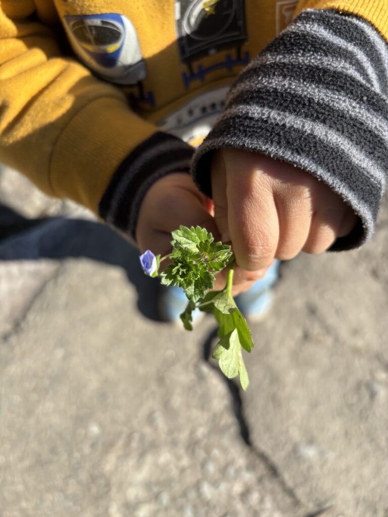 お花大好きなI君は、春一番のお花を見つけて嬉しそうでした。