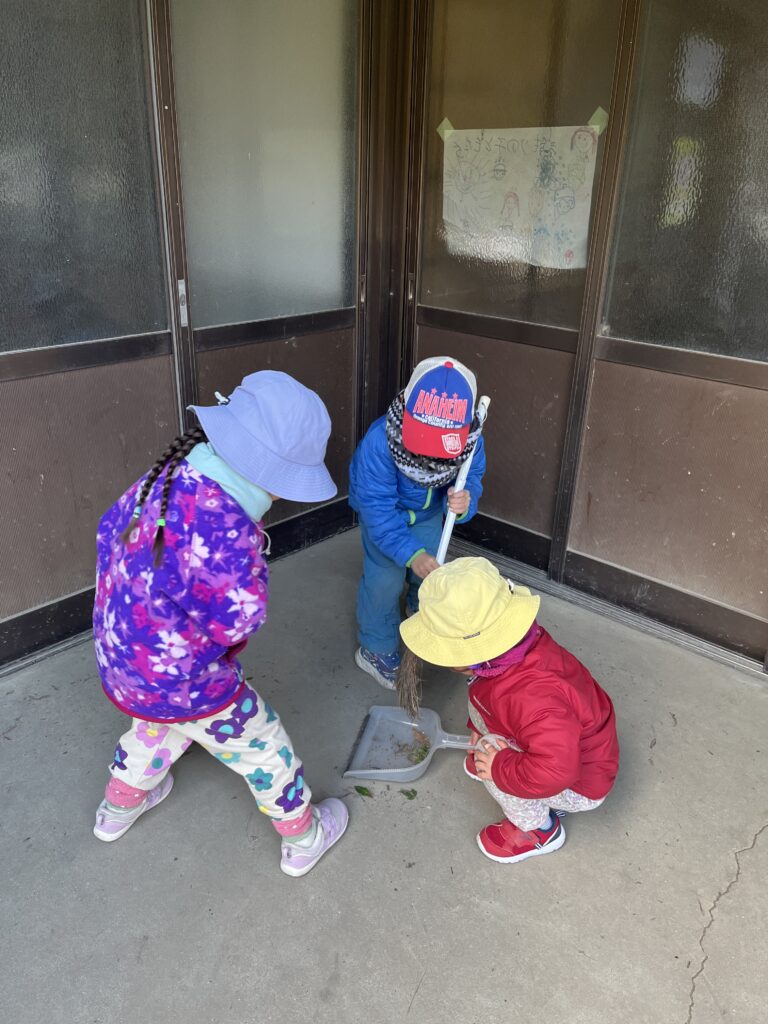 朝の会の前、早く登園してきた子たちが箒で掃き掃除していました。