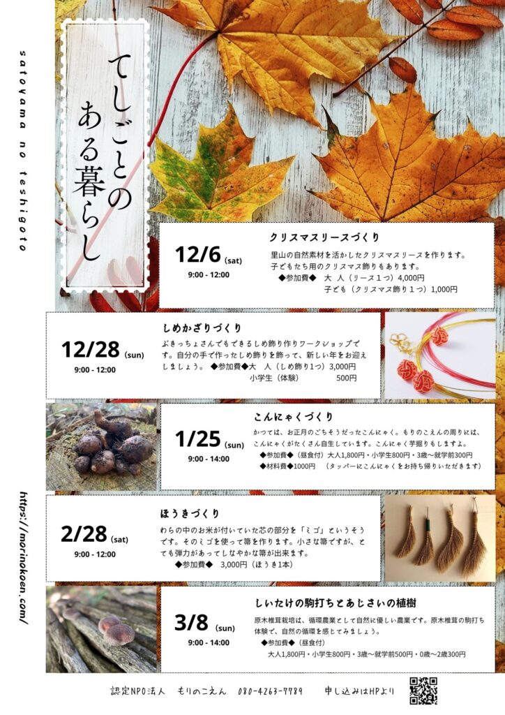 里山の自然素材を活かしたクリスマスリースを作ります。子どもたち用のクリスマス飾りもあります。