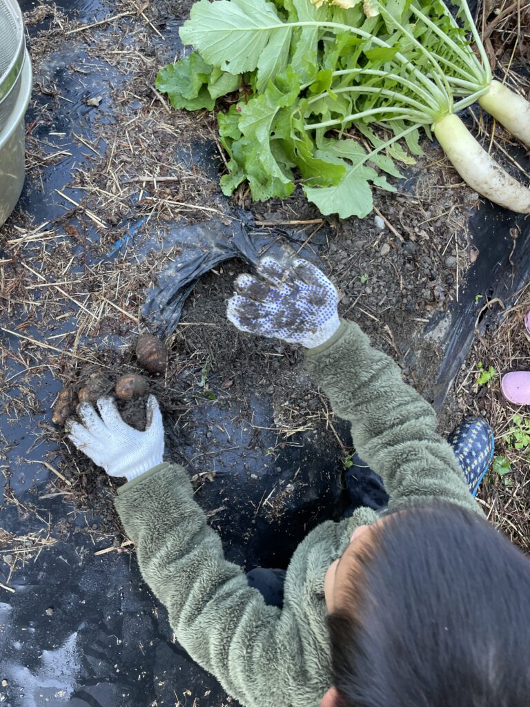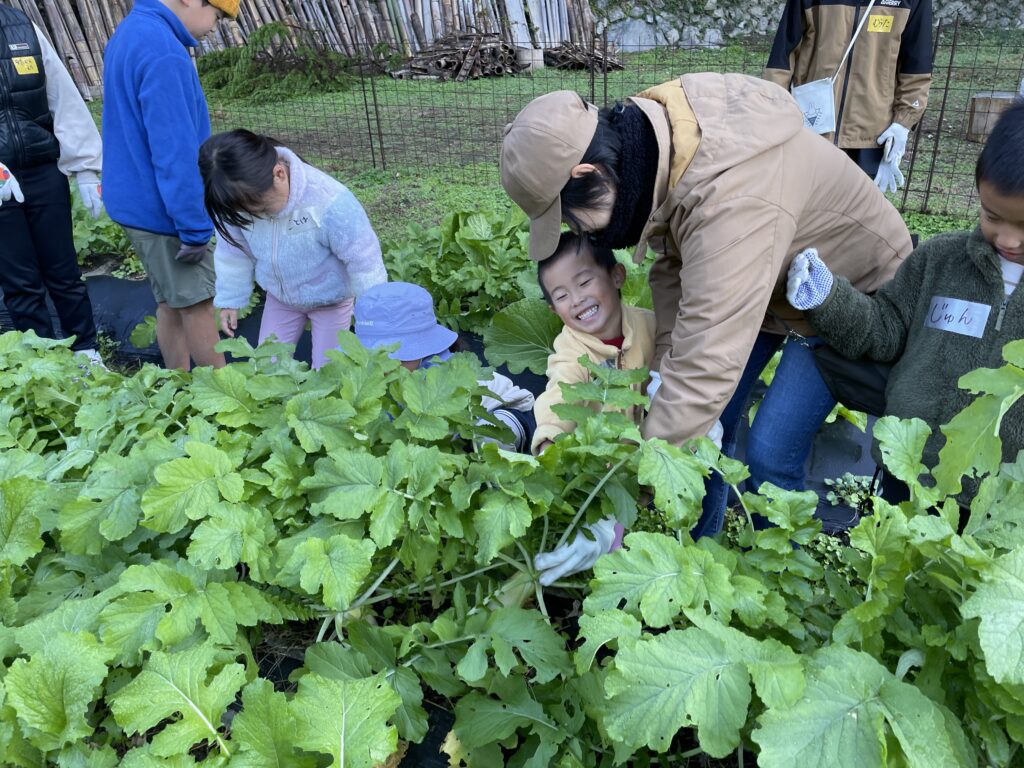 大根、水菜、白菜、里芋。もりのこえんの冬野菜は元気いっぱいです。
