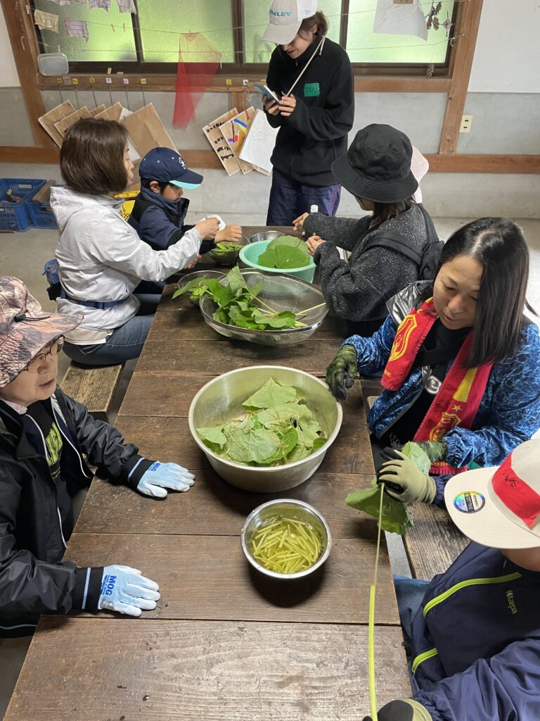 朝からみんなでフキ仕事。