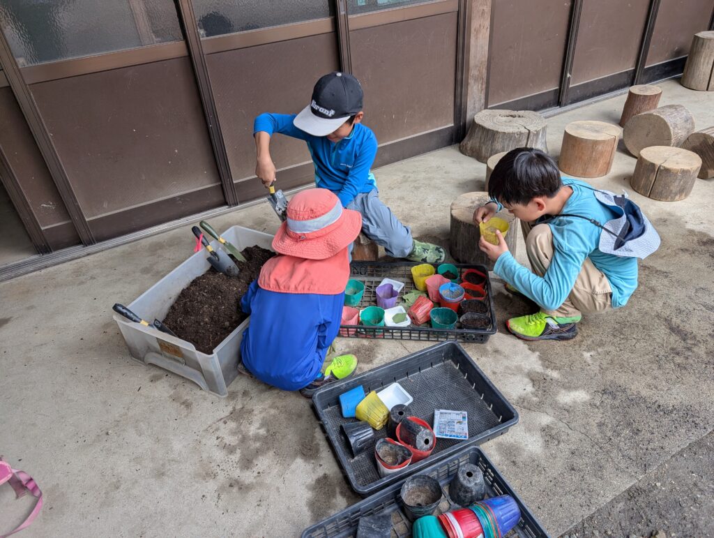大人が畑の整理(夏野菜を撤去し、冬野菜を植えるための準備。)している間に、子ども達は白菜の種をポットへ植えてくれました〜。たまに覗くと、途中からは、土の中から金?銀?を探すという遊びが…(笑)。確かに、もりのこえんがあるもう少し上の、鳳翩山麓には、かつて一の坂銀山が栄えていたとはいえ…(笑)。でも野菜作りに必要な様々な「菌」の豊富な上天花の土ではあります。