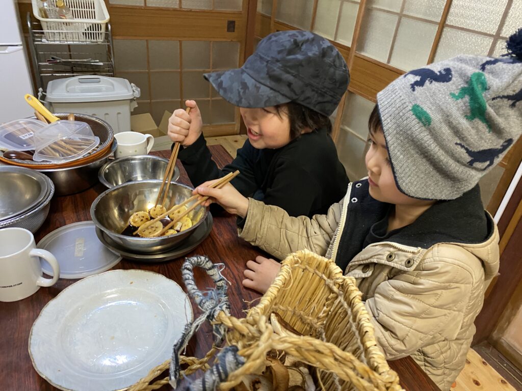 今日のイバーショは、お昼ご飯を子ども達が全て作る企画!まずは、食材を収穫。椎茸は、ついでにホダ木を移動しました。