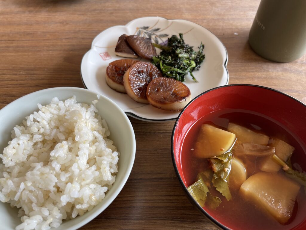 メニューは、大根ステーキ・椎茸焼いたの・春菊のごま和え・味噌汁・ご飯・晩白柚と白玉だんごのデザートと、Kちゃんが作って持ってきてくれたメレンゲクッキー。