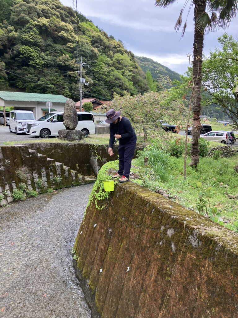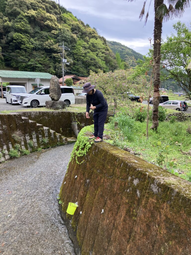 作業をしているとご近所さんと出会い挨拶を交わしました。1度別れてまた戻って来られたときにはその方が片手にバケツを持っていて、植樹したあとの水やりに使いなということで置いていってくださいました。実際にやってみると、バケツの傾け具合やあげるタイミングなどを見計らう必要があり面白かったです。うまく汲めたときは「やった!」と思わずガッツポーズ。水の用意1つでも、いつもと少し違うだけでワクワクが生まれるんだなあと思いました。水汲みは楽しいものでしたが、肝心の植樹は、土を掘ると石がたくさんある場所だったため苦労しました。頑張って植えたので、うまく根付いてくれるといいなと思います。