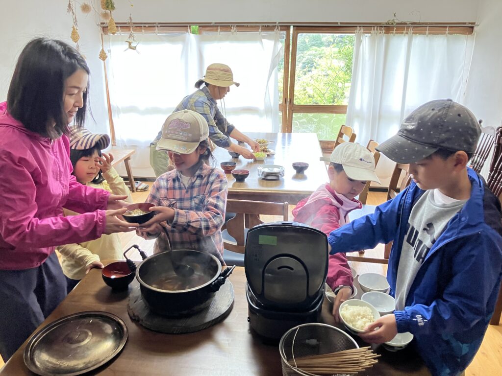 あみあみも外作業もひと通り終わったところで昼食タイム。各々が違うことをしていても、食事の時は集まって食べる。語らう。いい時間です。