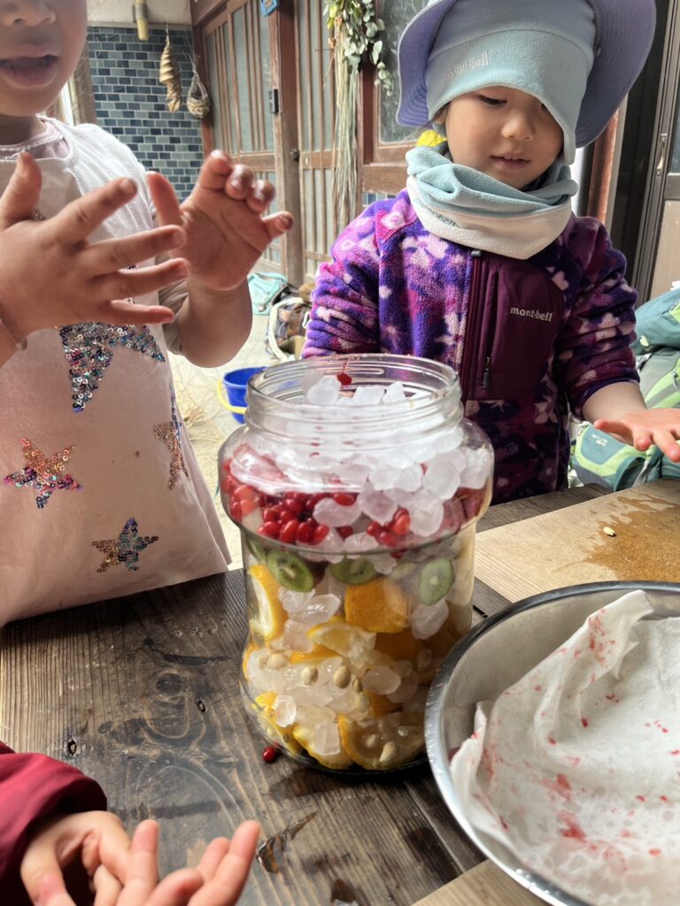 今日はキウイとサンシュユとゆずを使って3色の綺麗なシロップの元が出来上がりました。