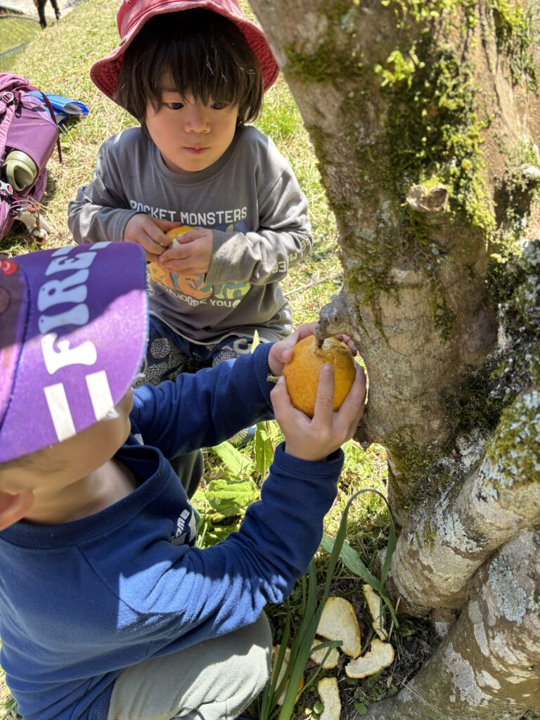 もりのこえんでは、スイートスプリングなど硬い皮の果物も、よく切れる石(本当によく切れるものをちゃんと探してくる!)で剥いたり、それを真似して他の子もよく切れる石を探したり。