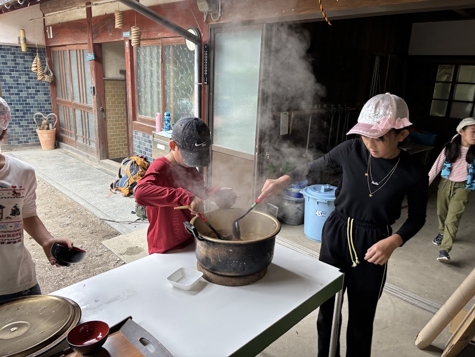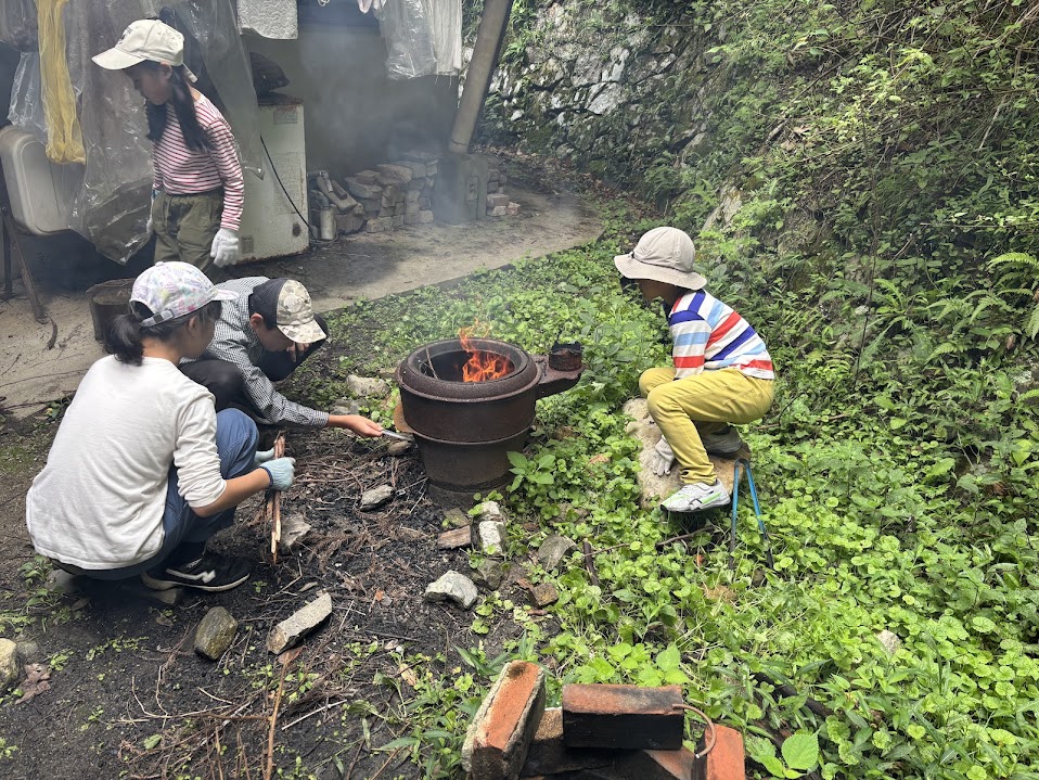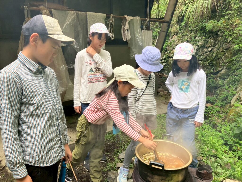 野菜収穫、食器洗い、食材を切る、火を起こす、等、1人1人に仕事を与え、